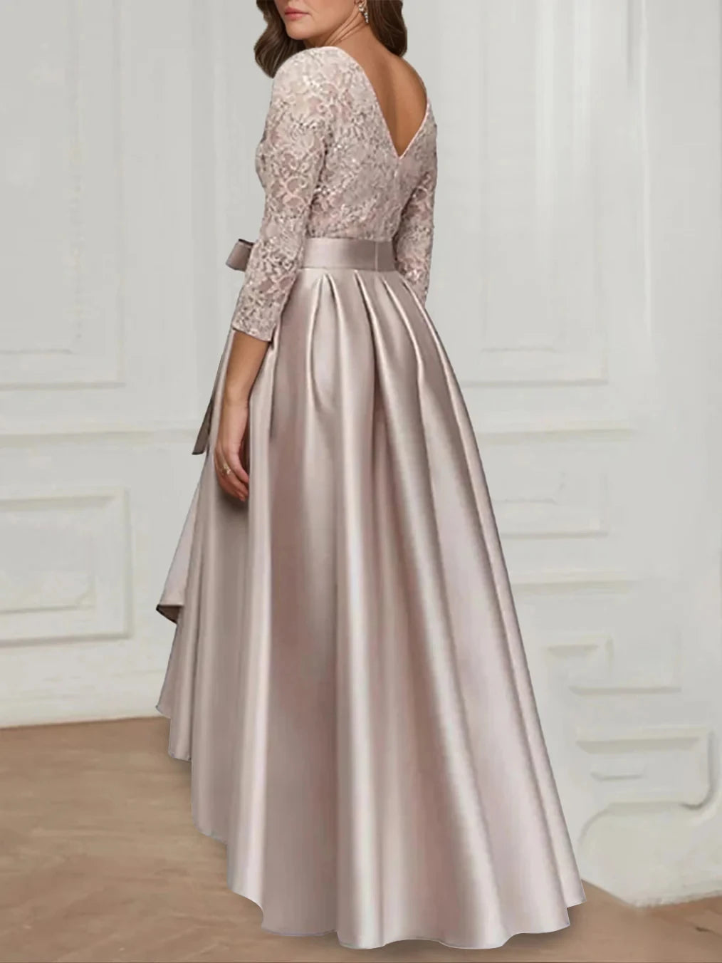 This plus-size mother of the bride dress features an A-line silhouette with a princess cut, a jewel neckline, and elegant 3/4 length sleeves. Its asymmetrical design is complemented by a charming bowknot, creating a graceful and flattering look for your special day.